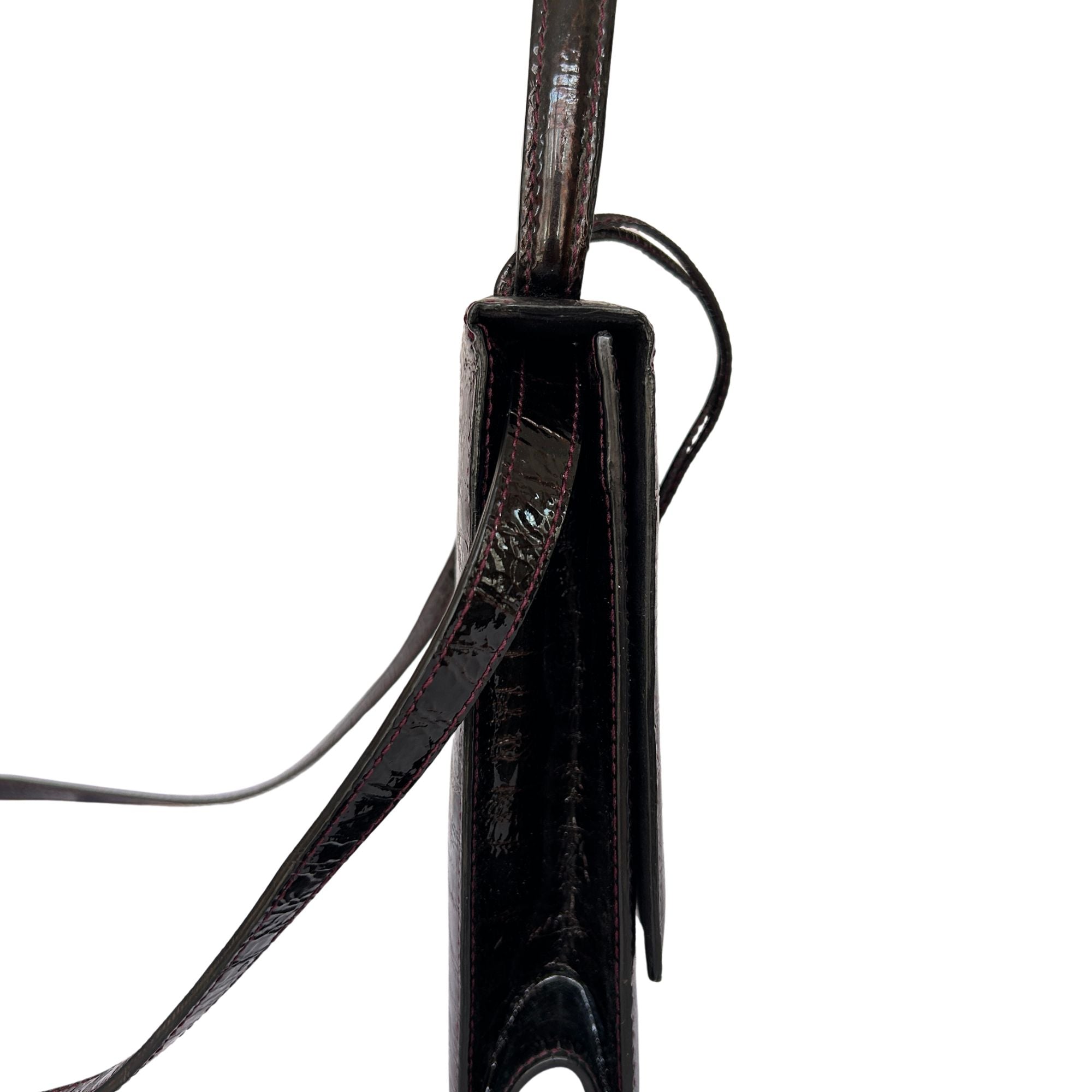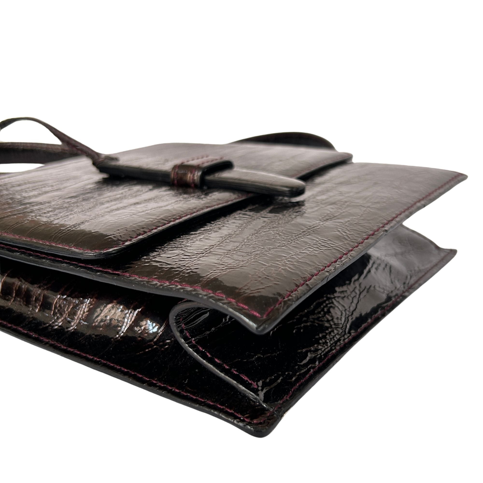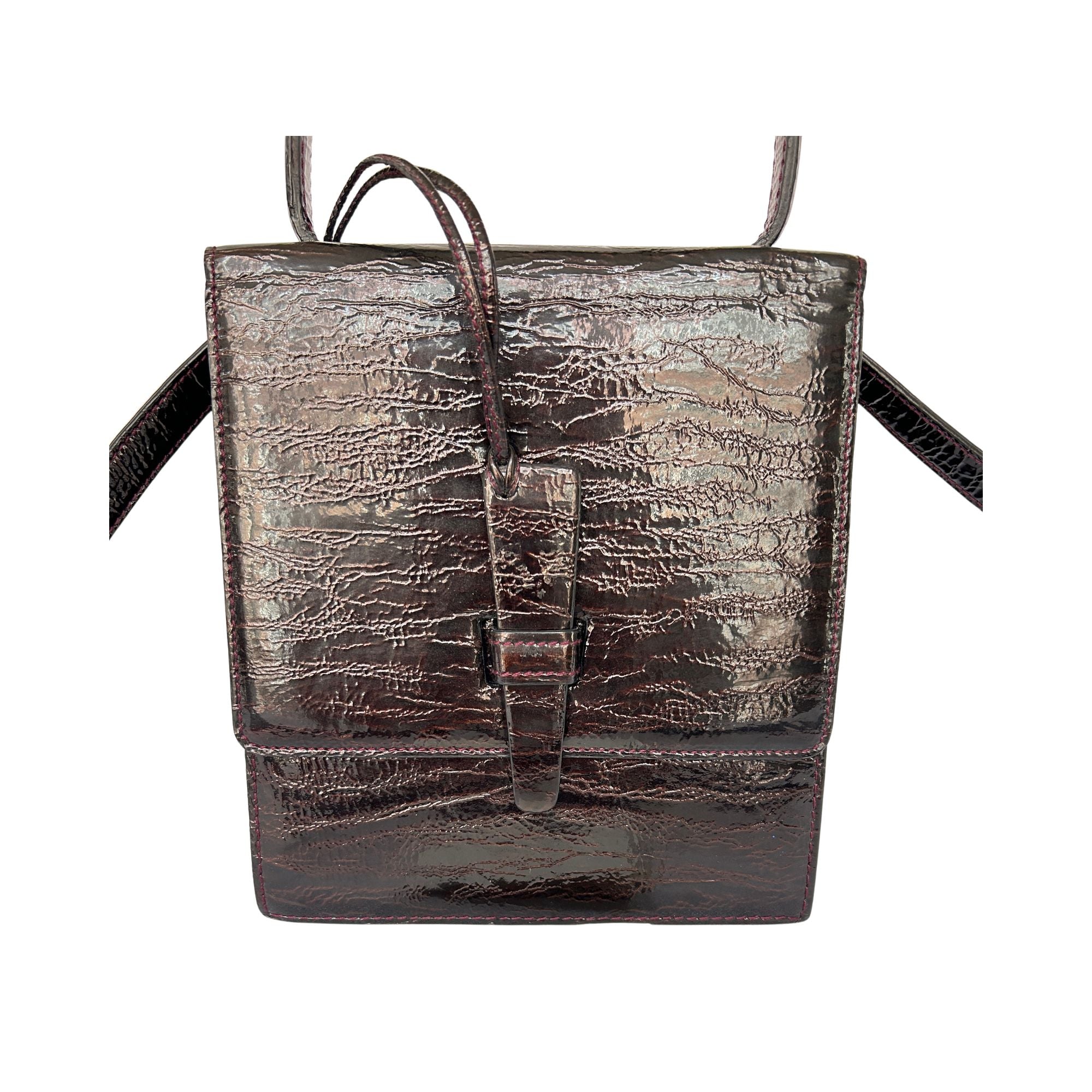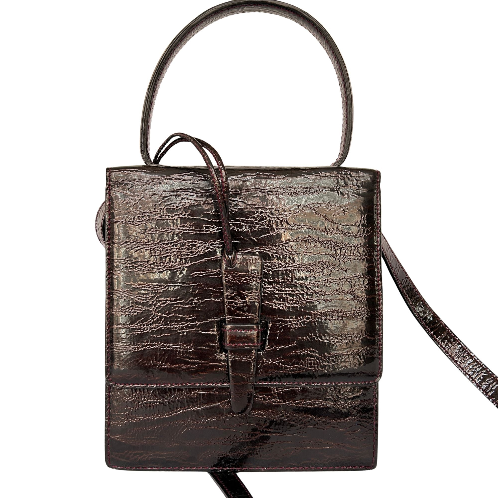 Loewe Vintage edición especial de Barcelona, tipo bandolera , confeccionado en charol con efecto craquelado en un profundo y elegante tono marrón. Destaca por su sofisticado cierre de solapa con trabilla de piel y una silueta estructurada de líneas limpias.