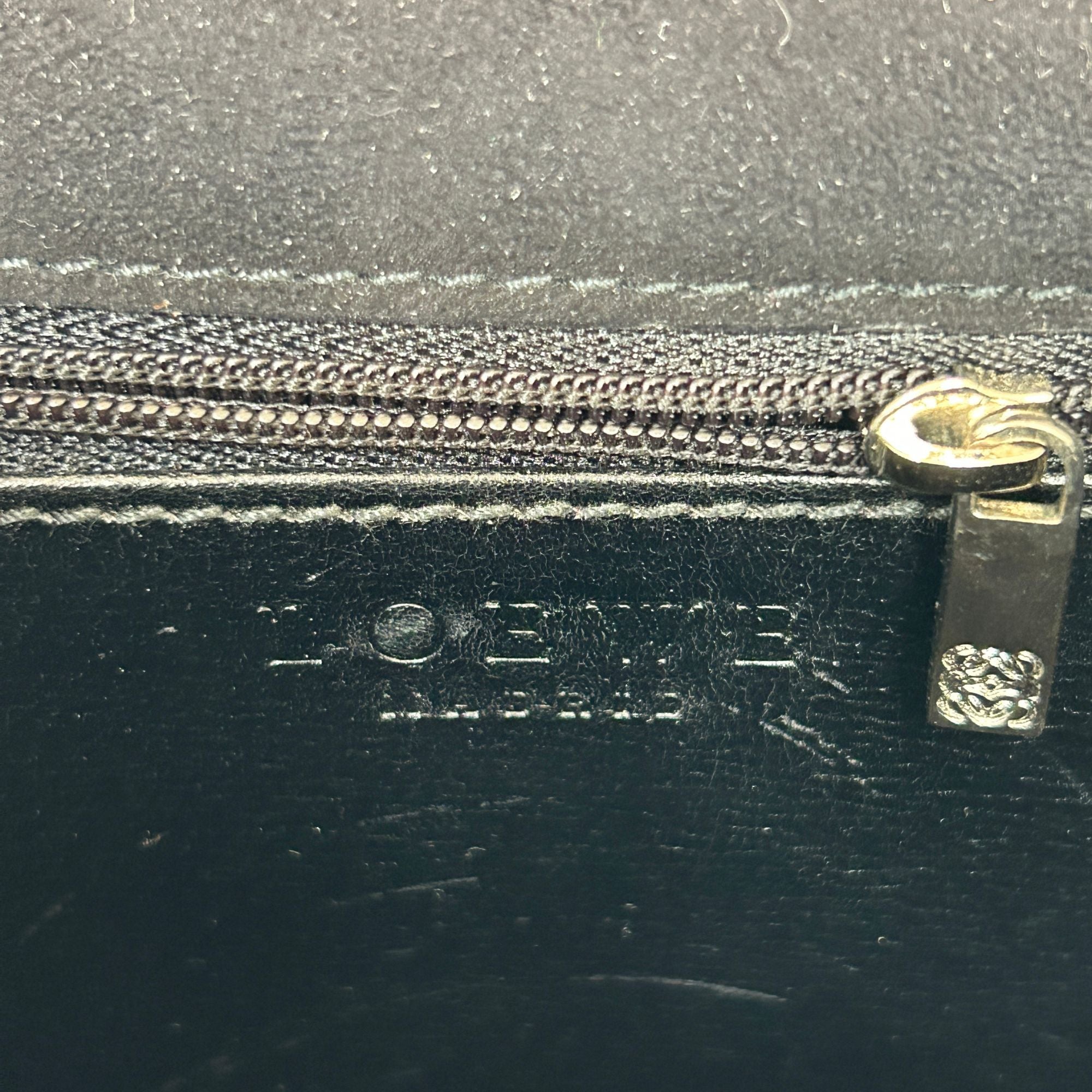 El interior está meticulosamente cuidado, presentando un forro de seda jacquard con el monograma de la firma, un compartimento con cremallera y el distintivo logotipo "Loewe Madrid" grabado en la piel. Un tirador de cremallera dorado con el icónico anagrama de Loewe. Tiene una correa de 94cm que permite usarlo cruzado.