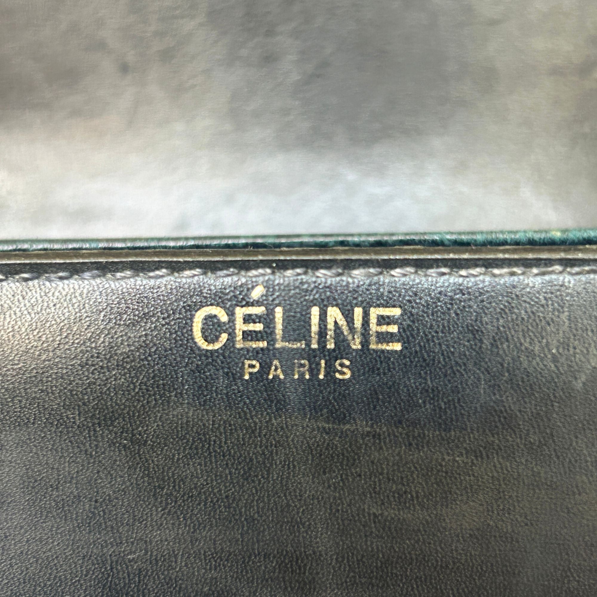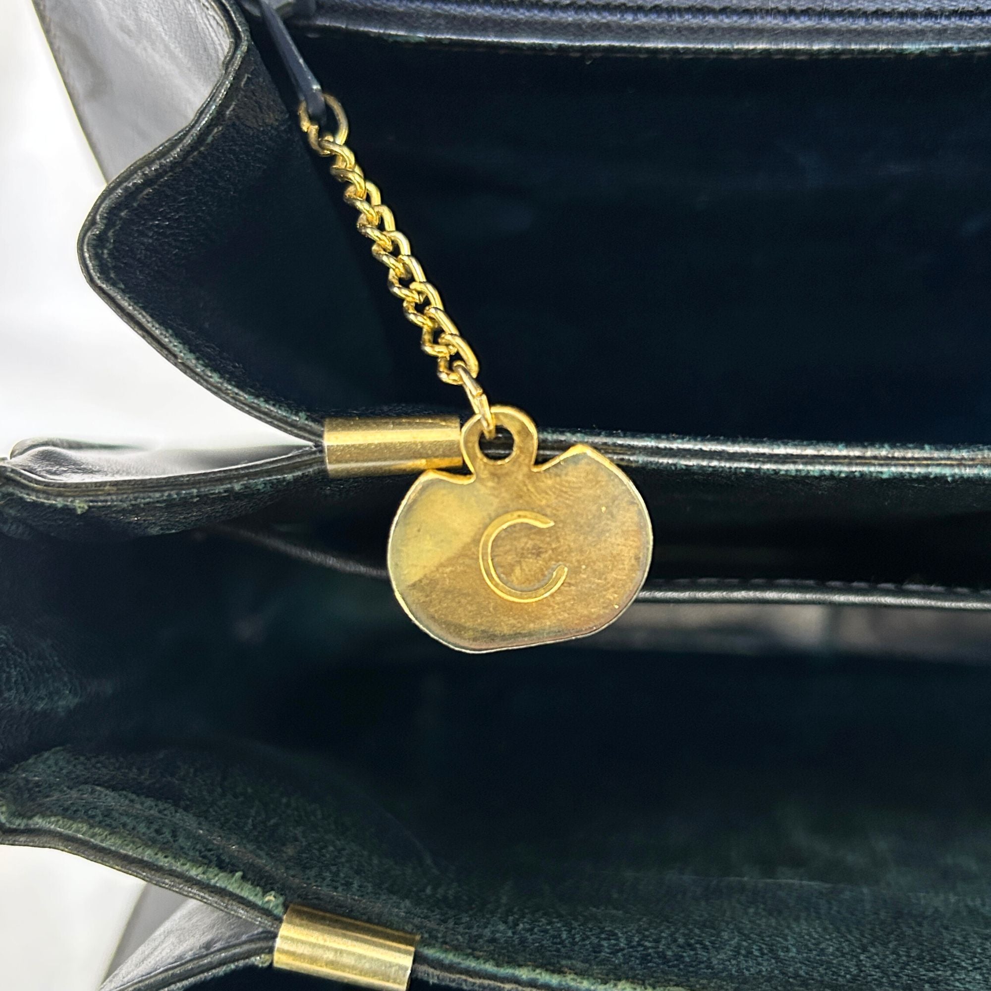 The design is distinguished by its iconic gold-tone carriage hardware, which features a natural patina and some areas where the plating has worn away, highlighting its authenticity. The interior, stamped with "Céline Paris" and "Made in Italy," is organized into three open compartments and a zip pocket decorated with a "C" initial charm.